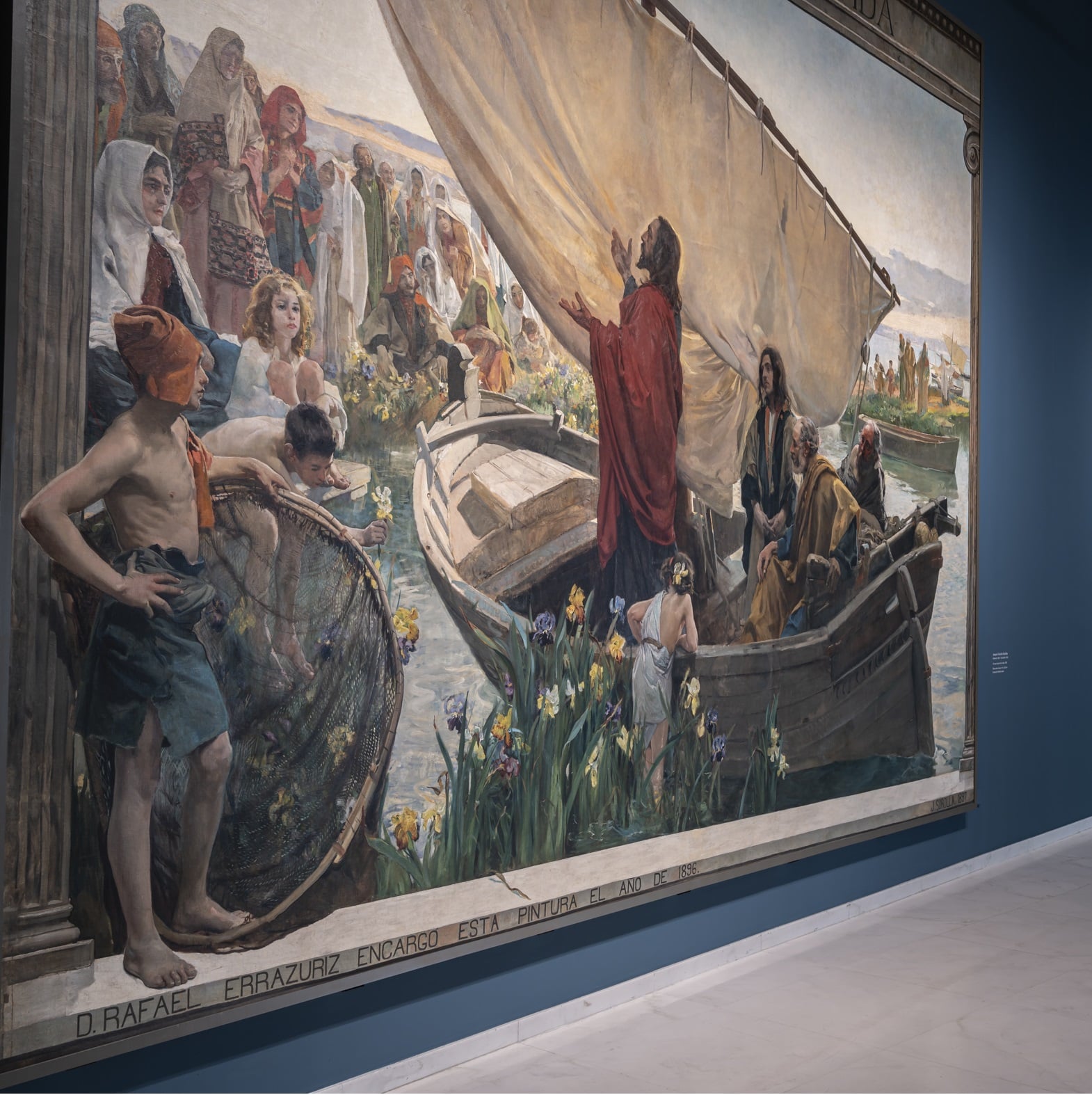 En la composición, aparece Jesucristo sobre una barca de vela latina como la utilizada por los pescadores valencianos, tripulada por tres discípulos desde donde se dirige a la multitud que le escucha desde la orilla. Sorolla empleó como modelos a los pescadores y pescadoras de la playa de la Malvarrosa enalteciéndolos y convirtiéndolos en personajes de una escena bíblica. El pintor ordena la escena principal con un ritmo diagonal ascendente hacia la izquierda cuyo punto culminante es la imagen de Jesús de perfil, modulando los brazos al ritmo de sus palabras.
