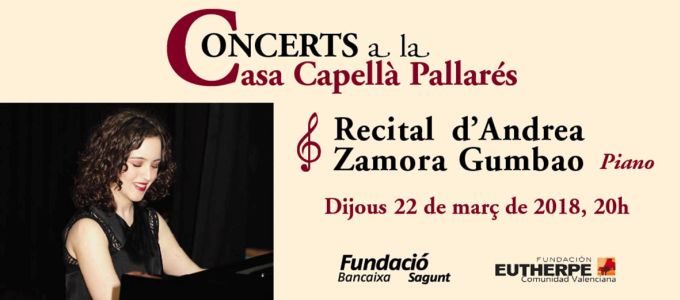 La joven pianista Andrea Zamora Gumbao ofrecerá el próximo jueves 22 de marzo un recital de piano dentro del ciclo Concerts a la Casa Capellà Pallarés organizado por la Fundación Bancaja en Sagunto con la colaboración de Fundación Eutherpe. El programa incluirá piezas de Beethoven (Sonata núm. 23 en fa menor, Opus 57, Appassionata), Chopin (Polonaise-Fantaisie, Opus 61) y Debussy (Suite Bergamasque).